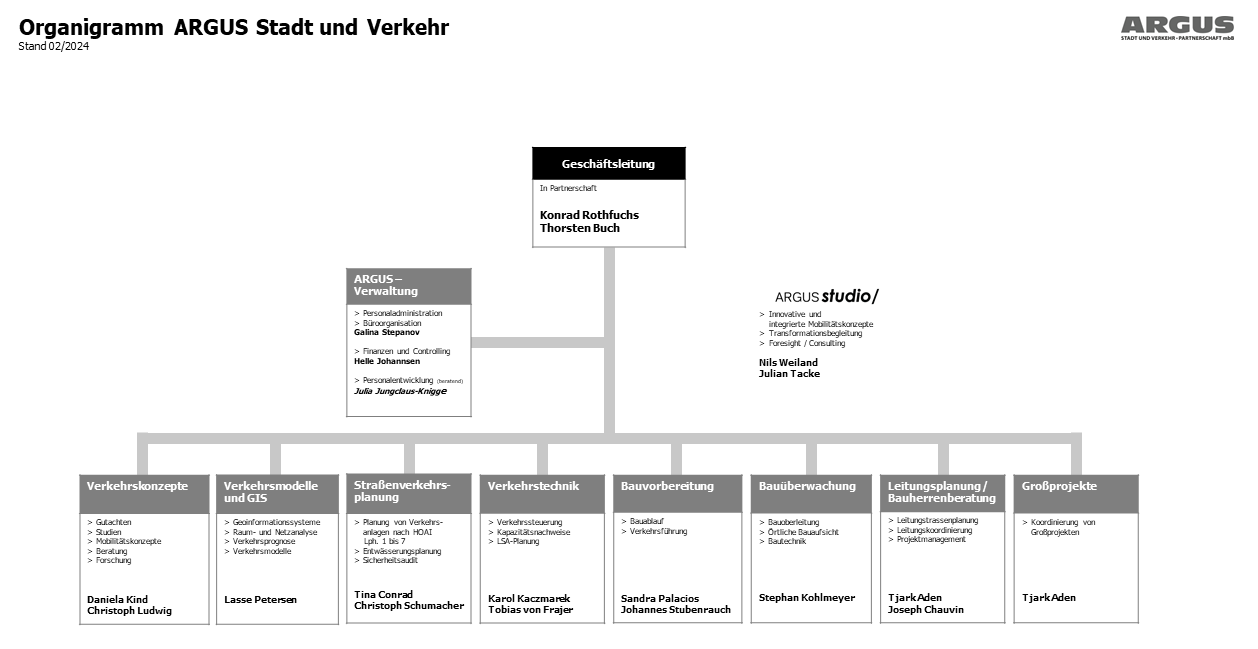 Als Dienstleister für die öffentliche Hand und private Unternehmen bearbeitet ARGUS seit Jahren ein umfangreiches Aufgabenspektrum im Bereich Stadt- und Verkehrsplanung und ist dabei ständig mit neuen Herausforderungen konfrontiert. Für eine unkomplizierte und effiziente Zusammenarbeit mit allen Akteur:innen stehen wir dabei für Kompetenz und kurze Entscheidungswege in sämtlichen Planungs- und Ausführungsphasen. Die Wahrung eines objektiven Blicks stellt neben der Selbstverpflichtung zur Termintreue und dem Streben nach höchster fachlicher und formaler Qualität das Grundprinzip unserer Arbeit dar. Dieses Denken und Handeln gibt uns seit der Gründung die Möglichkeit, immer wieder neue Themenbereiche zu erschließen und ARGUS ständig weiterzuentwickeln. Eine flache Hierarchie, offene Türen in jeder Etage und ein großes Vertrauensverhältnis in die Arbeit aller Mitarbeitenden, bilden dabei den Kern für das Gelingen jeder Aufgabe und einer nachhaltigen Zusammenarbeit.